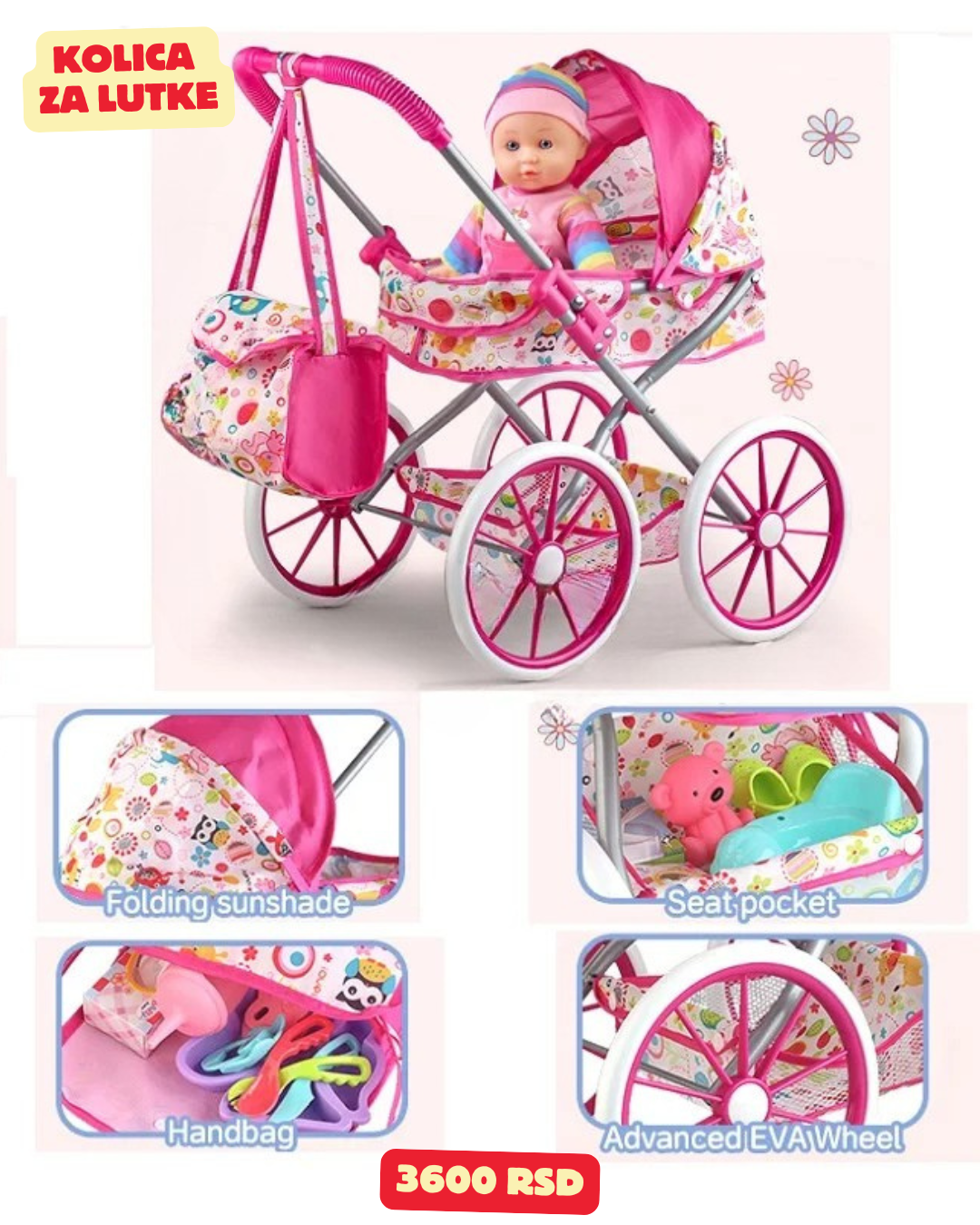Kolica su idealna za lutke standardnih dimenzija i podstiču razvoj mašte, kreativnosti i socijalnih veština kod dece.