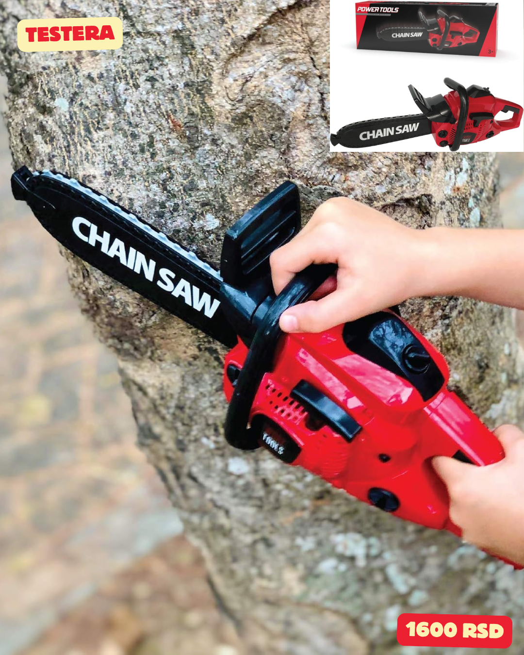 Kul električni alat, igračka motorna testera na baterije sa rotirajućim lancem i realističnim zvucima, igra pretvaranja, odličan poklon za decu od 3 godine i više, BAŠ KAO PRAVA MOTORNA TESTERA!“ Ova sjajna igračka motorna testera na baterije dolazi sa bezbednim rotirajućim lancem i realističnim zvučnim efektima. Izgleda i zvuči baš kao prava stvar! Deca će voleti da se igraju sa rotirajućim lancem, zvukom startera i zvučnim efektima užeta. BEZBEDNOST NA PRVOM MESTU: Naša igračka motorna testera se okreće konstantnom brzinom koja je bezbedna za decu, a dodali smo i posebnu ugrađenu mehaničku oprugu kako bismo osigurali da se lanac neće zaglaviti. Rotirajući lanac je napravljen od meke plastike, nije oštar i odmah će prestati da se okreće kada vaše dete slučajno stavi ruku na njega. IGRAJTE ULOGE I UČITE DA RAZVIJATE MLADE MOTORIČKE VEŠTINE: Počnite da gradite već danas sa ovom igračkom motornom testerom na baterije. Realistični zvuci i rotirajući lanac će pokrenuti sate maštovite igre. Dužina oko 40 cm