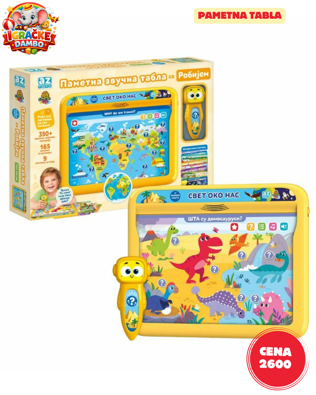 Ova interaktivna igračka vodi decu kroz svet životinja, svemira, vozila i mapa sveta – uz govor, muziku i pitanja koja bude znatiželju. Dete dodirom pametne olovke Robi dobija odgovor, objašnjenje ili kratku melodiju. 🎧🧠