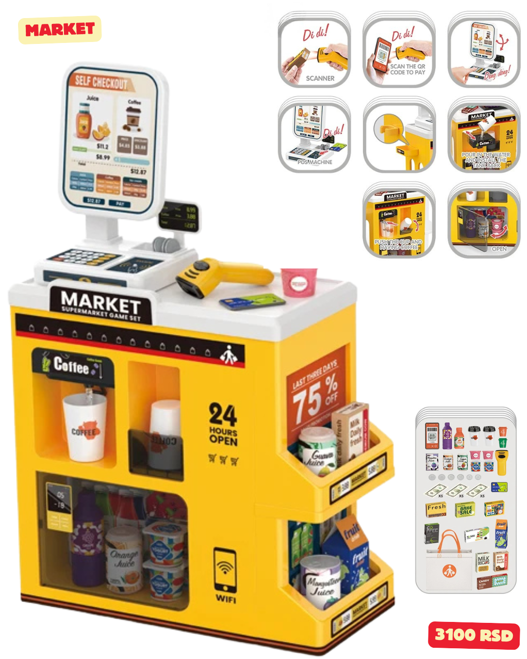 U kompletu se nalazi kasa,čitač bar kodova i još 47 različitih dodataka (novčanice, proizvodi ….)