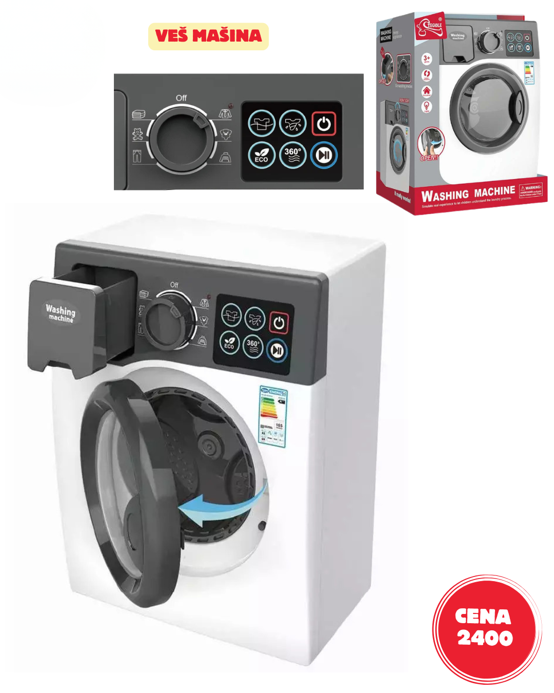 Verodostojna veš mašina za mališane koji vole da pomažu roditeljima u kućnim poslovima. Pruža pravi doživljaj zahvaljujući realističnim funkcijama, kao što su otvaranje vrata i rotacija bubnja. Poseduje i svetlosne efekte.